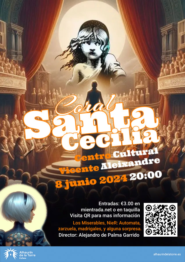 La Coral Santa Cecilia se complace en presentar en su localidad, Alhaurín de la Torre, su repertorio para 2024 bajo la nueva dirección de Alejandro de Palma Garrido. Iniciando nuevos caminos, idiomas y temáticas, pero sin olvidar la tradición que la ha caracterizado desde su fundación a principios de los noventa.