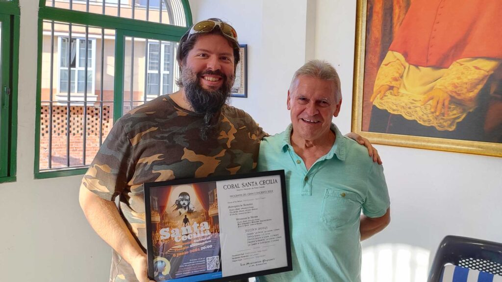 Durante el ensayo de ayer la Coral Santa Cecilia consideró conveniente y merecido agradecer a nuestro director Alejandro de Palma Garrido su trabajo y paciencia, y reconocer el mérito de dotar de nuevos aires a la Coral y llevarla mucho más allá de los que considerábamos sus límites naturales y para ello le hicimos entrega de un cuadro conmemorativo del gran concierto del pasado 8 de junio.